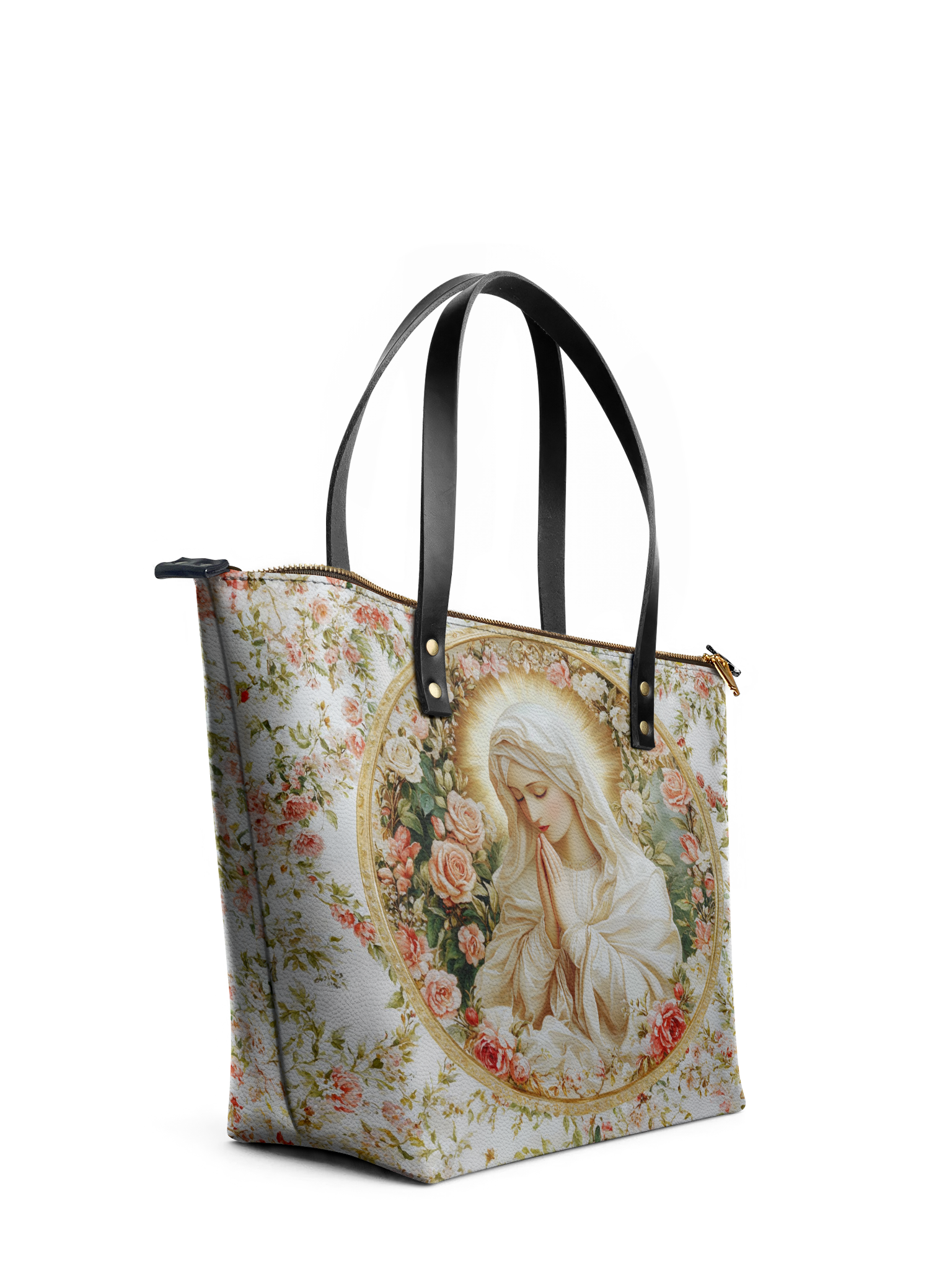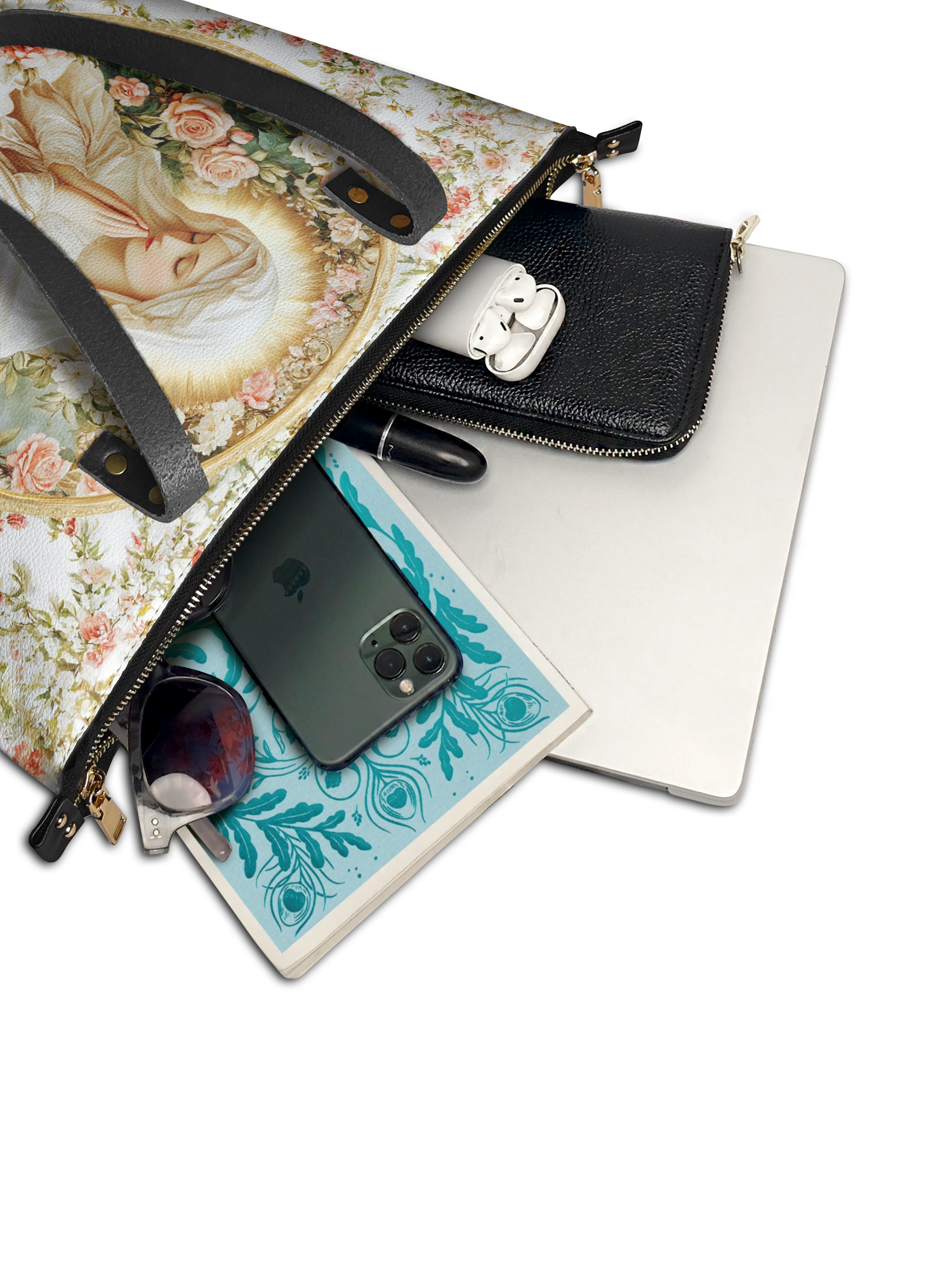 This tote bag is spacious and practical, easily fitting 2 large print Bibles, a 13" laptop, books, and daily must-haves.