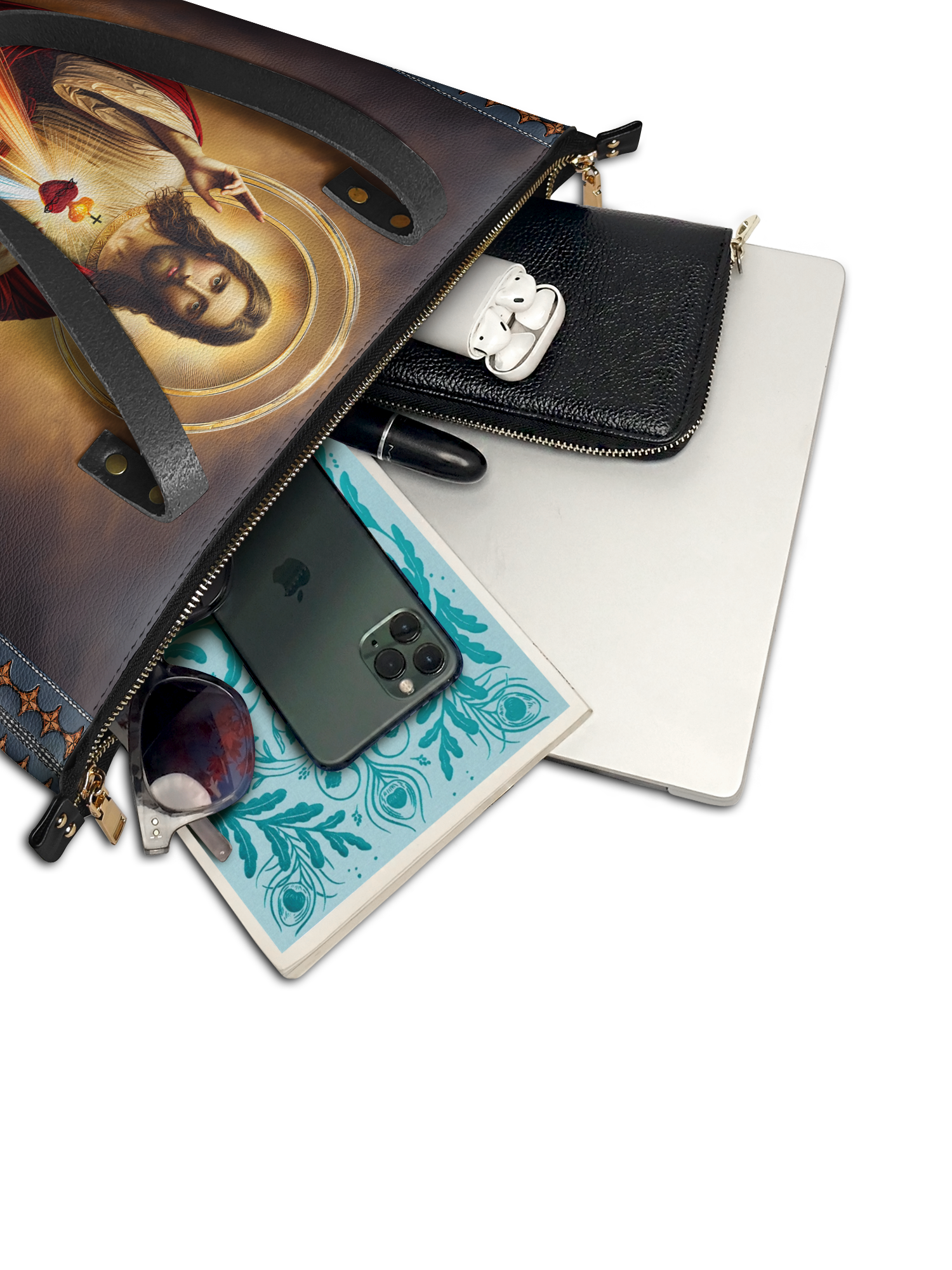 This tote bag is spacious and practical, easily fitting 2 large print Bibles, a 13" laptop, books, and daily must-haves.